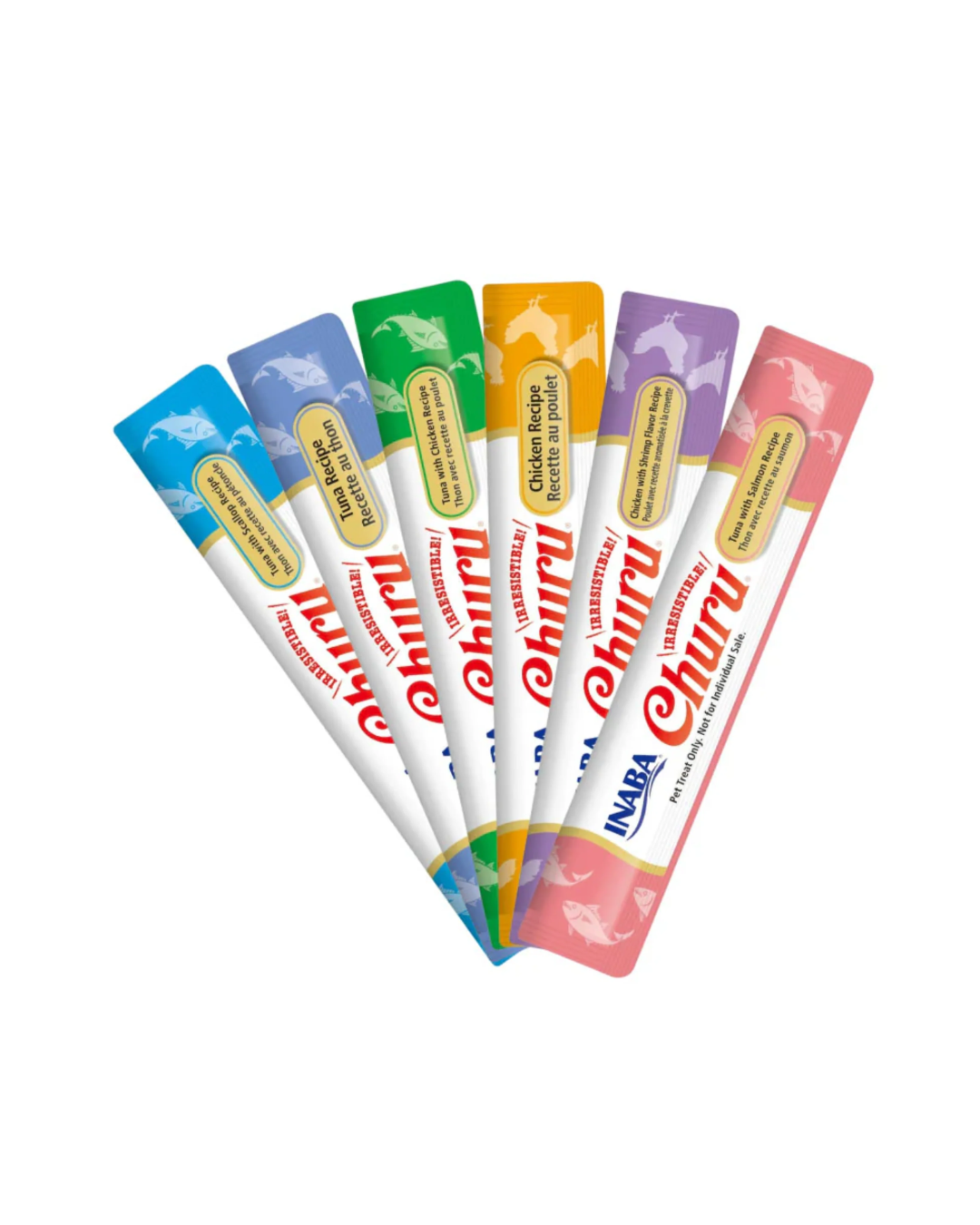 Churu sabor variado es un snack cremoso para gatos, hecho con ingredientes naturales, libre de granos, conservantes y colorantes artificiales, ofreciendo alta humedad para la hidratación, bajo en calorías, ideal para reforzar el vínculo y dar medicinas, con sabores como atún, salmón, camarón, cangrejo y vieiras.