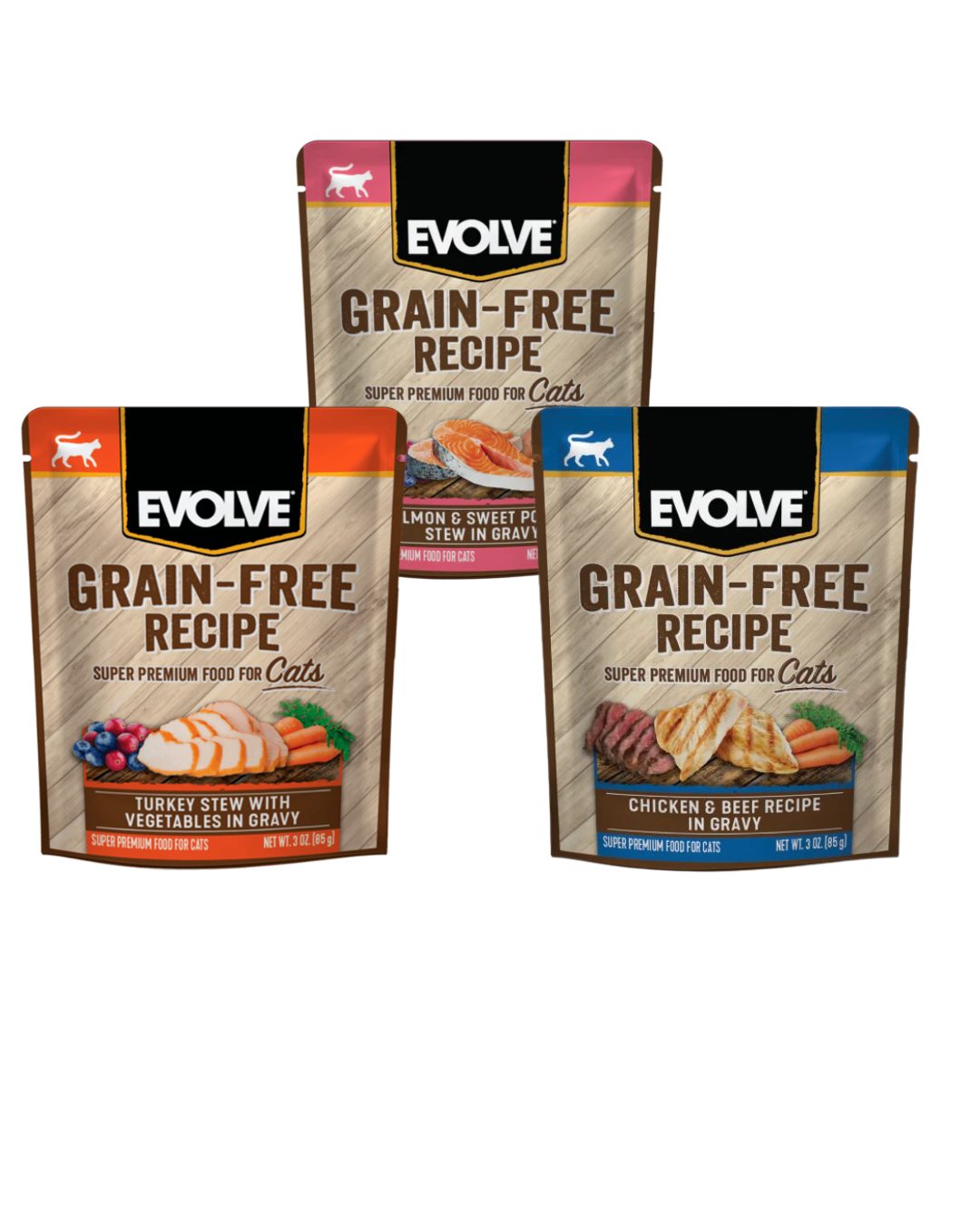 Los exclusivos Pouches Evolve Grain Free para Gatos estan hechos con CARNE REAL y con los mejores ingredientes junto con carbohidratos saludables SIN GRANOS y superalimentos como arándanos, arándanos agrios y más. Son una PODEROSA NUTRICIÓN DIARIA en cada bocado. Siéntase seguro de alimentar a su gato sabiendo que nuestras recetas están hechas con cero subproductos de aves de corral, maíz, soya o colorantes, sabores o conservantes artificiales. Además, ¡es perfecto como comida por sí solo o como un sabroso aderezo de croquetas! ¡Simplemente abra la bolsa, vierta y observe cómo abunda el amor de su gato por usted.