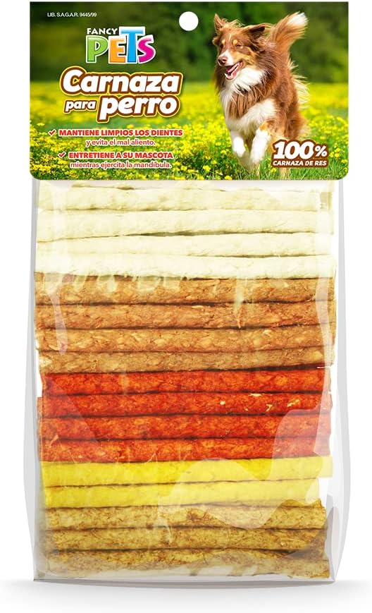 Los palitos de carnaza son snacks masticables populares para perros, hechos de cuero crudo triturado, que ayudan a limpiar los dientes y entretener a la mascota.