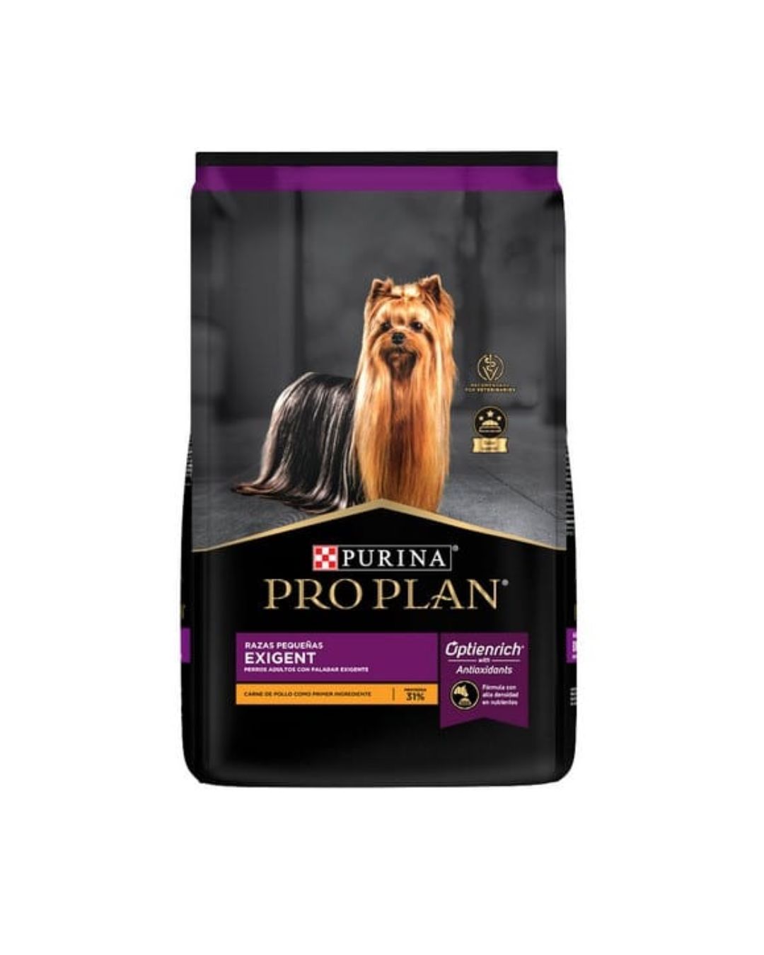 Pro Plan Exigent Razas Pequeñas es un alimento Super Premium, de Purina, diseñado para perros adultos (1-7 años) con paladares exigentes y quisquillosos. Con proteína de pollo como ingrediente principal, alta palatabilidad y croquetas pequeñas, ofrece nutrición avanzada con OptiEnrich y VitaComplex-7 para fortalecer el sistema inmune, la salud de la piel y un pelaje brillante.