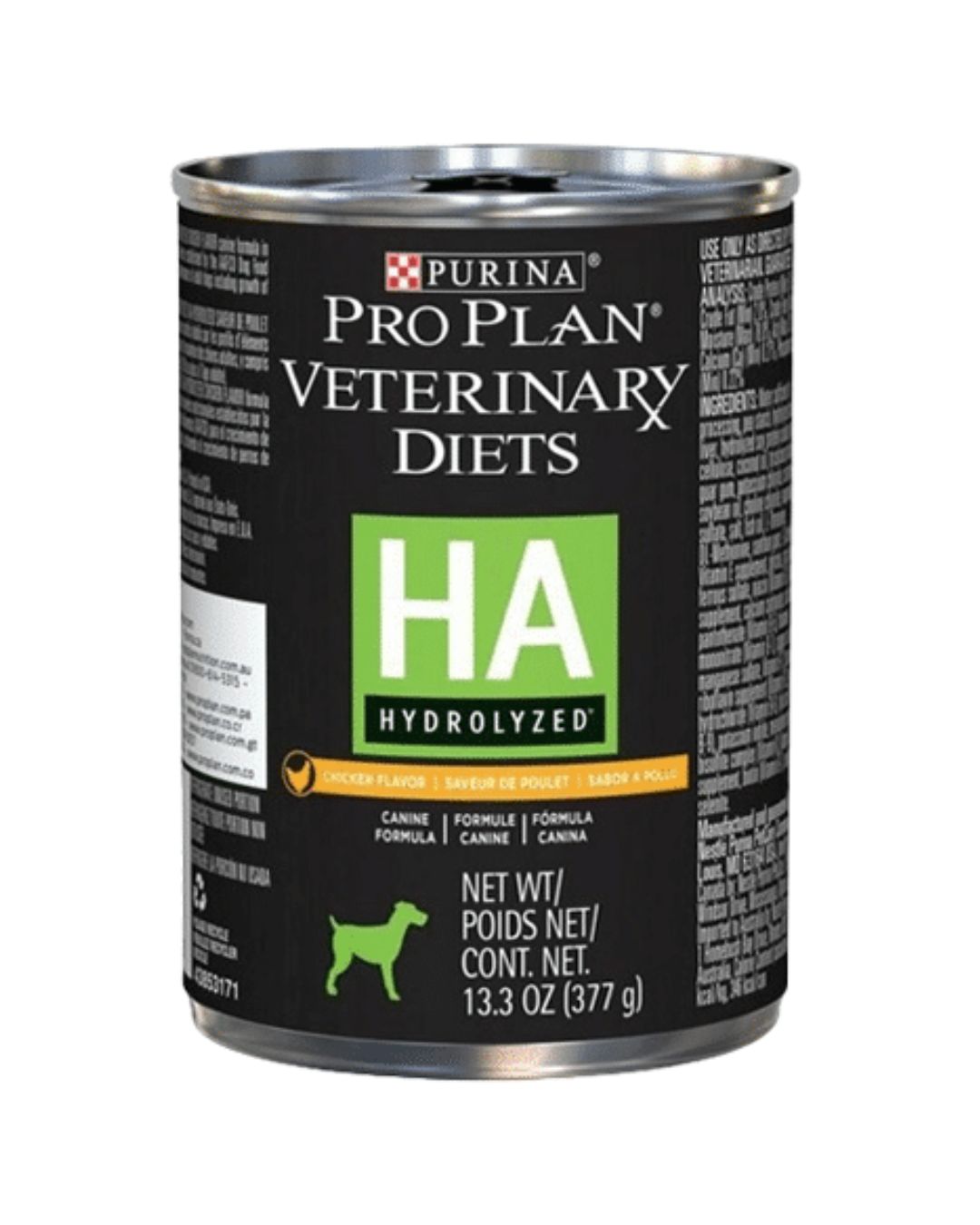 Pro Plan HA Hydrolized para perros (lata) es una dieta veterinaria húmeda de alta gama, ideal para perros adultos con alergias o intolerancias alimentarias severas. Su fórmula contiene proteína hidrolizada de bajo peso molecular (daltons), una única fuente de carbohidratos, alta digestibilidad y ácidos grasos Omega-3 para reducir inflamaciones.