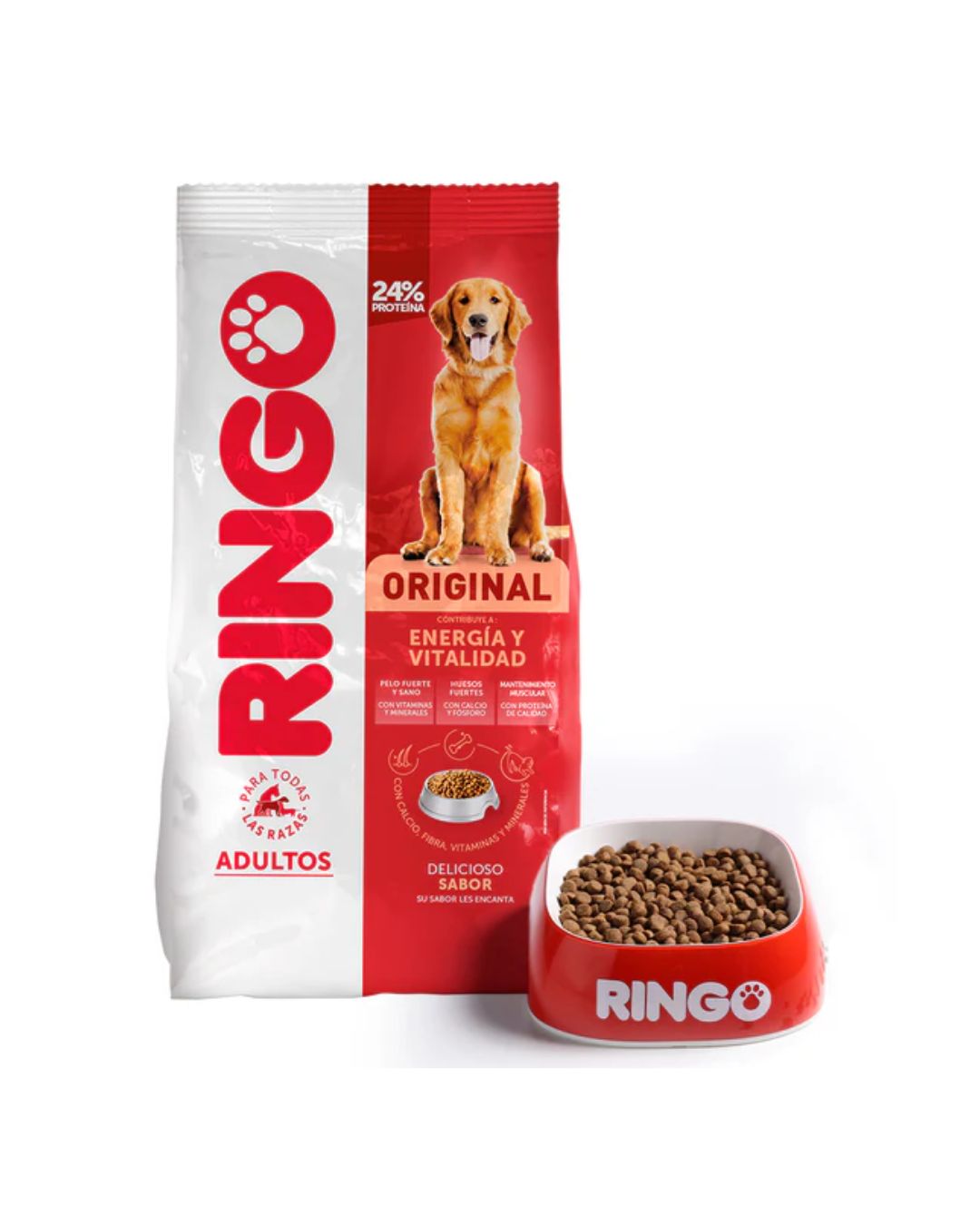 Ringo Adulto a granel es un alimento balanceado para perros adultos de todas las razas, con un 24% de proteína y 7-8% de grasa mínimo. Es una opción popular de alto rendimiento energético, ideal para perros con actividad física media-alta.